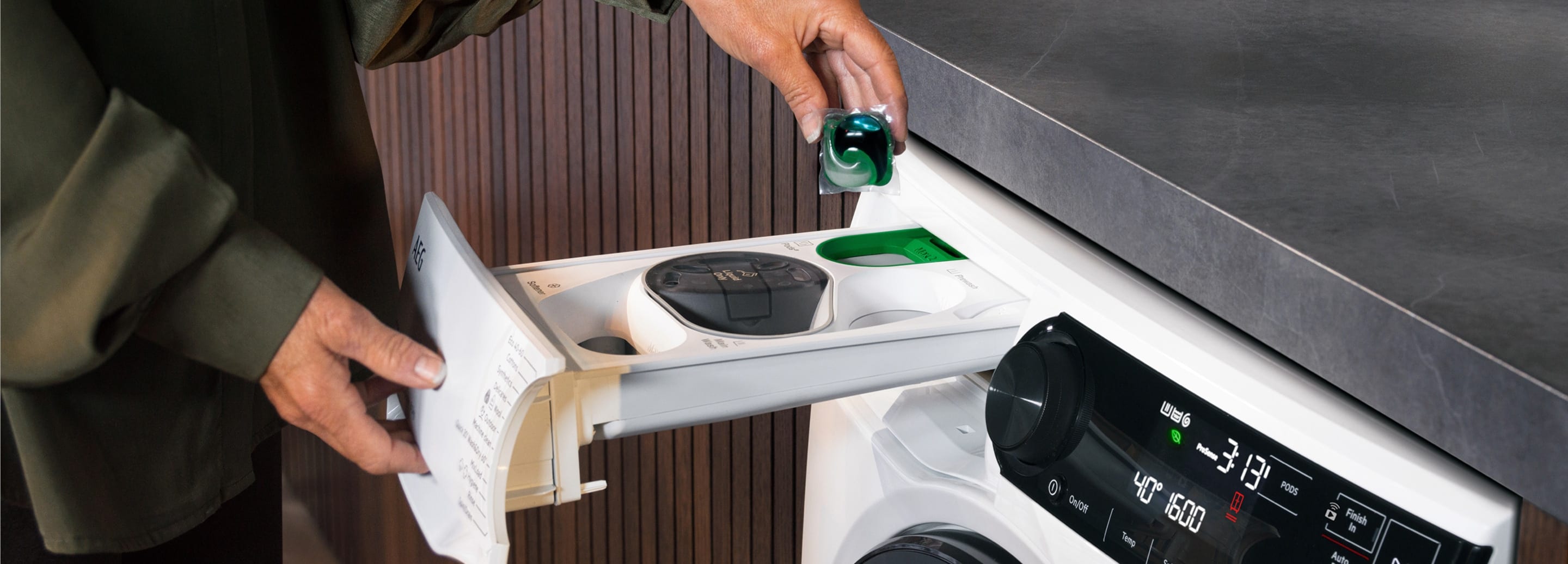 Az új AEG UniversalDose mosógépek szabadalmaztatott adagolófiókjában minden típusú mosószer tökéletesen feloldódik, még a mosókapszula is. A mosószerek tisztítóerejük maximumát nyújtják, ezért sokkal hatékonyabb a folttisztítás az alacsony hőfokú és a rövid programokon is.