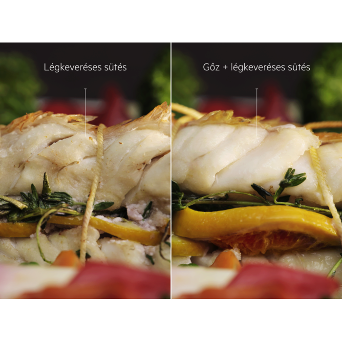 A SteamCrisp® funkcióval rendelkező SenseCook® 6000 sütő precízen süt a tökéletes eredmény érdekében. A gőz -és a hagyományos sütés kombinálásával a hús zamatosabb, a halételek pedig akár 20%-kal omlósabbak , mint a gőz funkció nélküli sütőben.