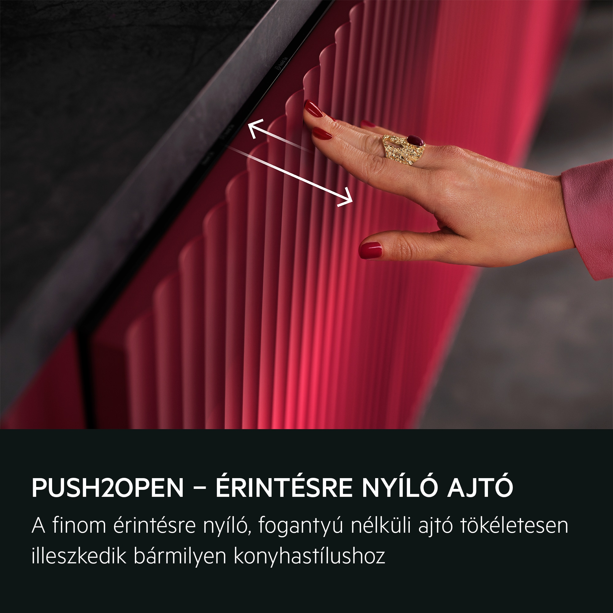 A Push2Open ajtó külső fogantyú nélkül tökéletesen illeszkedik a konyhabútorhoz. A nyitáshoz elég csak finoman megnyomni az ajtó felső, középső részét.