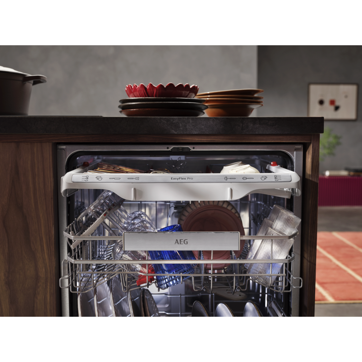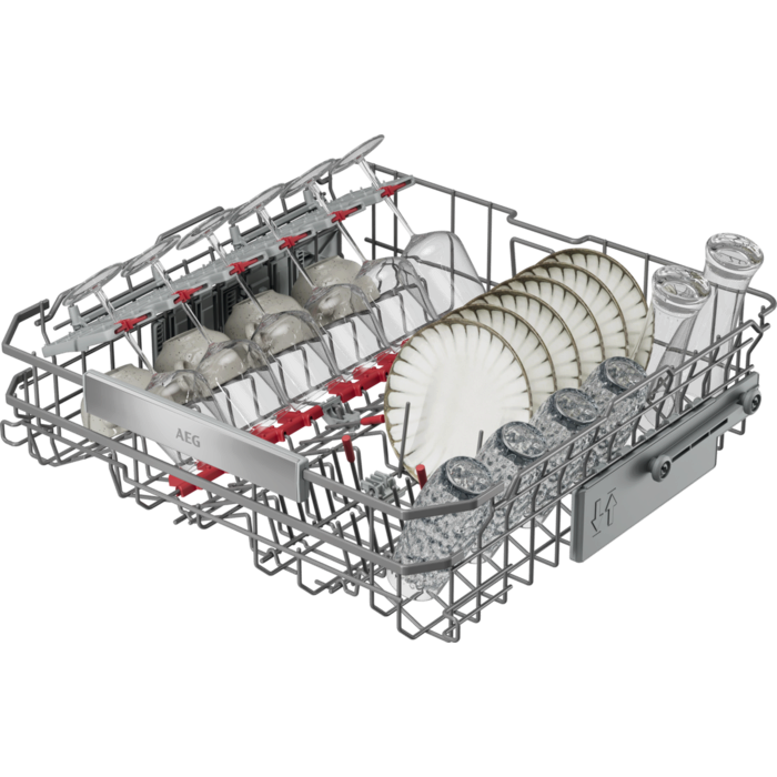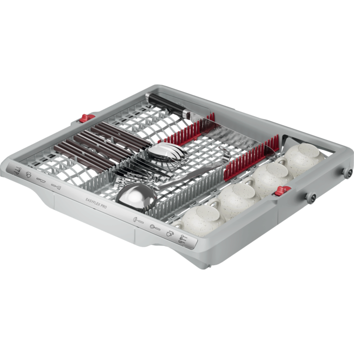 Az EasyFlex Pro kosarak könnyedén csúsznak, minden részük lehajtható a maximális rugalmasságért. A csúszásgátló gumitüskék biztonságban tartják a sima és talpas poharakat. Az evőeszköztartó fiókban elférnek a habverők, merőkanalak és kis csészék is.