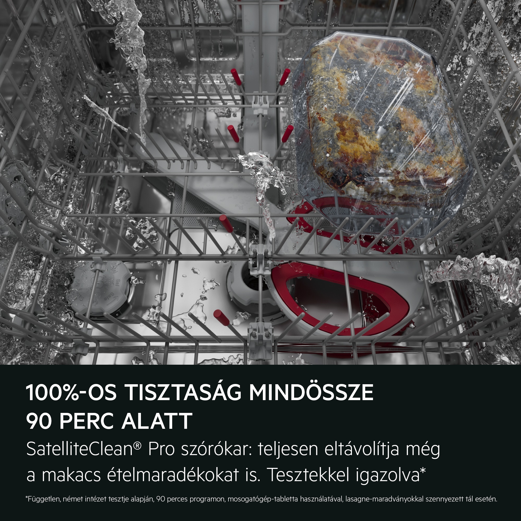 A SatelliteClean® Pro dupla forgó szórókarja több irányból juttatja el a vizet az edényekhez, így 100%-osan eltávolítja a makacs szennyeződéseket mindössze 90 perc alatt – plusz vízhasználat nélkül.