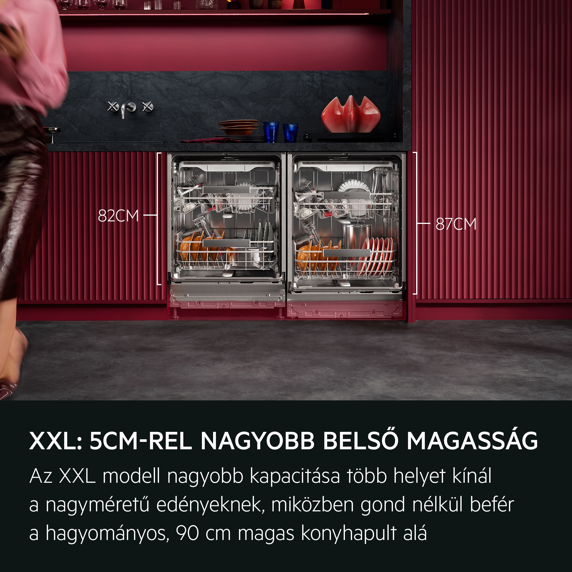 Az XXL Max modellekben elférnek nagyobb edények, például pizzás tányérok, magas söröspoharak vagy kancsók is, plusz víz- vagy energiahasználat nélkül. Az 5 cm-rel nagyobb belső tér ellenére alacsonyabbra szerelhető, így befér a hagyományos, 90 cm-es munkalap alá.