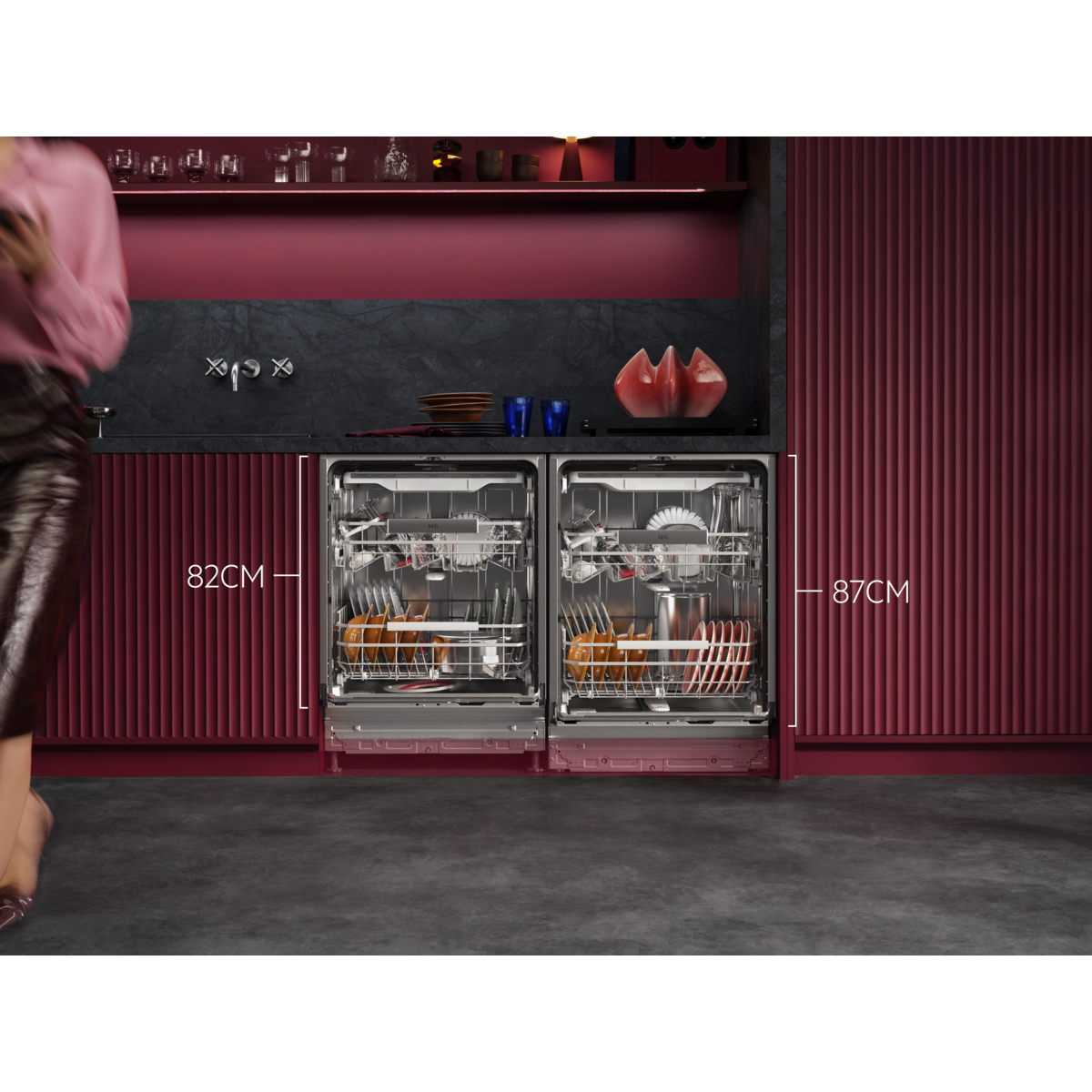 Az XXL Max modellekben elférnek nagyobb edények, például pizzás tányérok, magas söröspoharak vagy kancsók is, plusz víz- vagy energiahasználat nélkül. Az 5 cm-rel nagyobb belső tér ellenére alacsonyabbra szerelhető, így befér a hagyományos, 90 cm-es munkalap alá.