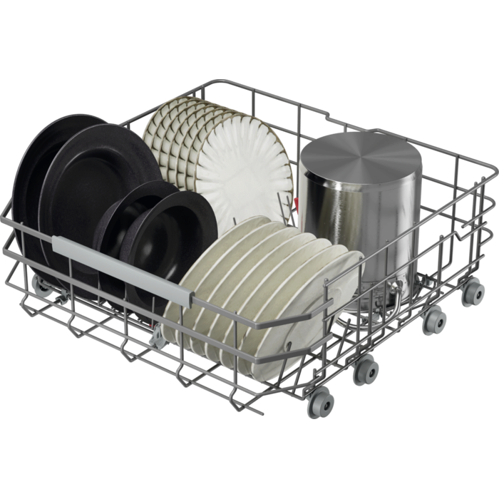 A továbbfejlesztett EasyFlex Plus kosarak könnyedén mozognak, a három lehajtható sorba a nehezen elhelyezhető edények is beférnek. A gumis tartókban a csúszásgátló tüskéknek köszönhetően a poharak biztonságban vannak. Az evőeszköztartó fiókba pedig a habverők és merőkanalak is kényelmesen elférnek.