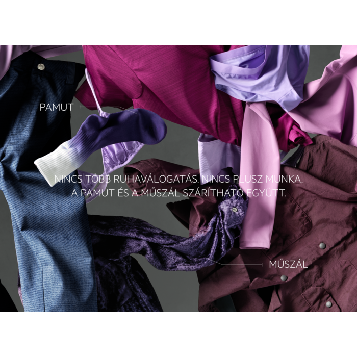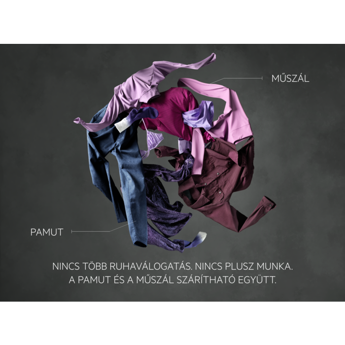 MIXDRY. NINCS VÁLOGATÁS. NINCS PLUSZ MUNKA. A PAMUT ÉS A MŰSZÁL EGYÜTT SZÁRÍTHATÓ.