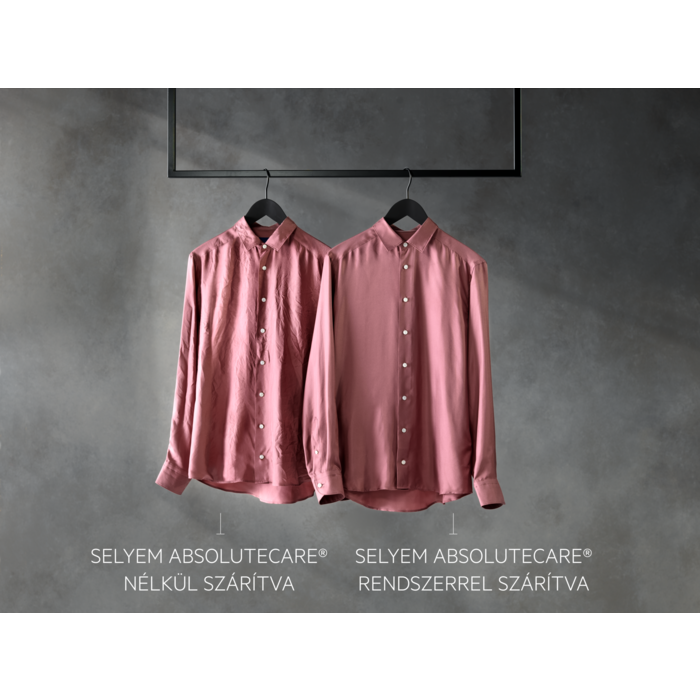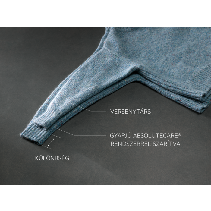Az AbsoluteCare® 8000-es szárítógép hőszivattyús technológiát használ. Precízen szabályozza szárítás közben a dob mozgását és a hőmérsékletet, ezzel biztosítva, hogy a gyapjú ne menjen össze és a selyem is megtartsa formáját. Az AbsoluteCare® visszaállítja a technikai ruhák vízlepergető képességét. Ezt a Woolmark Blue tanúsítvány is igazolja.