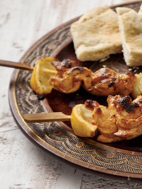 9. Tálalja a csirkenyársat a humusszal és a tabouleh salátával.