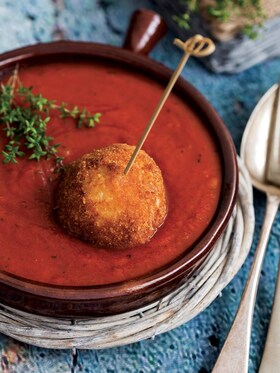 Paradicsom krémleves dióbundában sült ricotta golyókkal